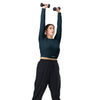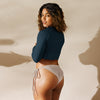 Questo crop top a maniche lunghe è realizzato in poliestere riciclato ed elastan, rendendolo una scelta eco-friendly per i look da bagno, sportivi o athleisure. Il crop top è dotato di un'etichetta di manutenzione staccabile e un'ampia fascia in vita a doppio strato per il massimo della comodità.